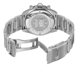 Čierny ciferník so slnečným brúsením ponúka stopky a dátumovku. Chráni ho zafírové sklíčko s antireflexnou vrstvou. Indexy, ručičky a bod na lunete majú luminiscenciu Super-LumiNova® pre výbornú čitateľnosť v tme.