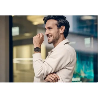 Hodinky majú elegantný čierny ciferník s výraznými arabskými číslami a indexmi, ktorý zabezpečuje dokonalú čitateľnosť. Kruhové oceľové puzdro s čiernou PVD úpravou o priemere 42 mm pôsobí robustne, ale zároveň zostáva ľahké – váži len 52,9 g.