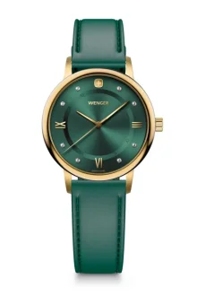 Hodinky Wenger 01.1721.116 z rady Urban Donnissima predstavujú moderné spojenie elegancie, funkčnosti a švajčiarskej precíznosti. Sú určené pre ženy, ktoré ocenia štýlový doplnok pre každodenné aj spoločenské príležitosti. Výrazný zelený ciferník je doplnený o Swarovski kamienok, ktorý pridáva nádych luxusu a jedinečnosti.