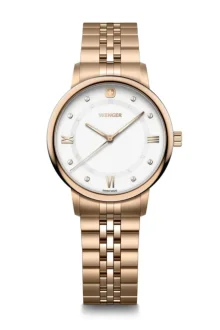 Hodinky Wenger 60.1721.119 z kolekcie Urban Donnissima prinášajú štýlový zážitok pre každú modernú ženu, ktorá hľadá kombináciu elegancie a praktičnosti. Tieto dámske hodinky očaria čistým bielym ciferníkom, ktorý zdobí žiarivé kamienky Swarovski – vďaka nim sa na zápästí stávajú skutočným šperkom!